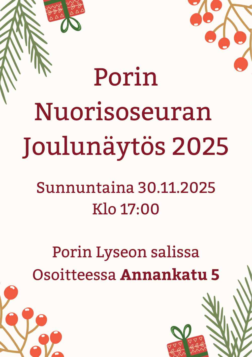 Tervetuloa Porin Nuorisoseuran joulunäytökseen! 🎅🎄🎁🕯️ Taas lähestymme aikaa, kun piparien ja glögin tuoksu valtaavat kodin ja tontut alkavat kurkkimaan ikkunoiden takana! Myös seuramme…