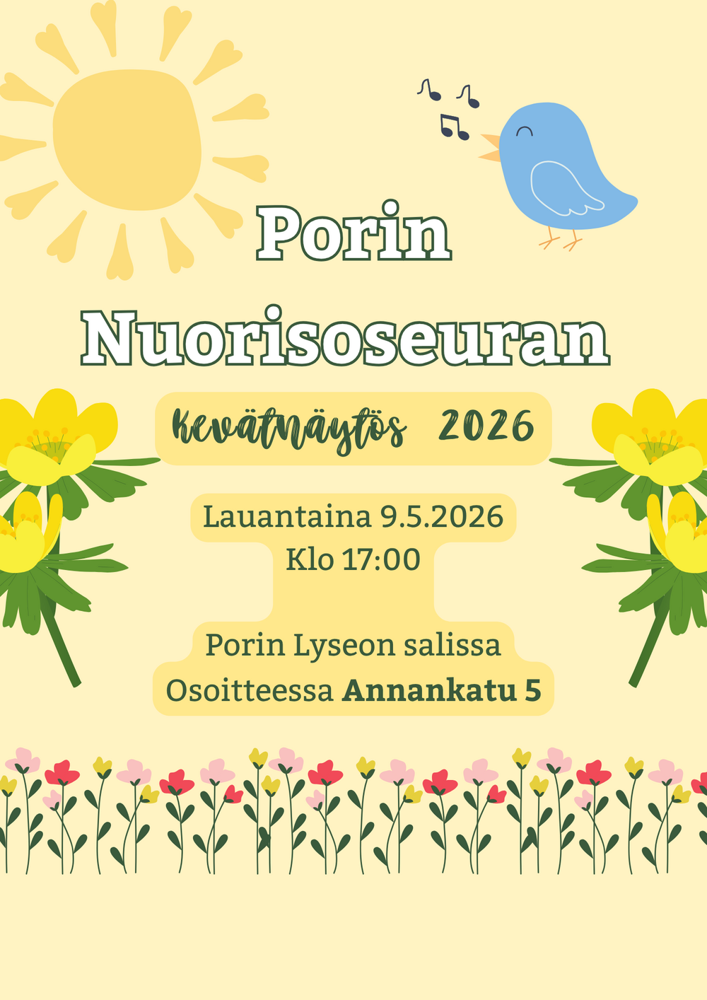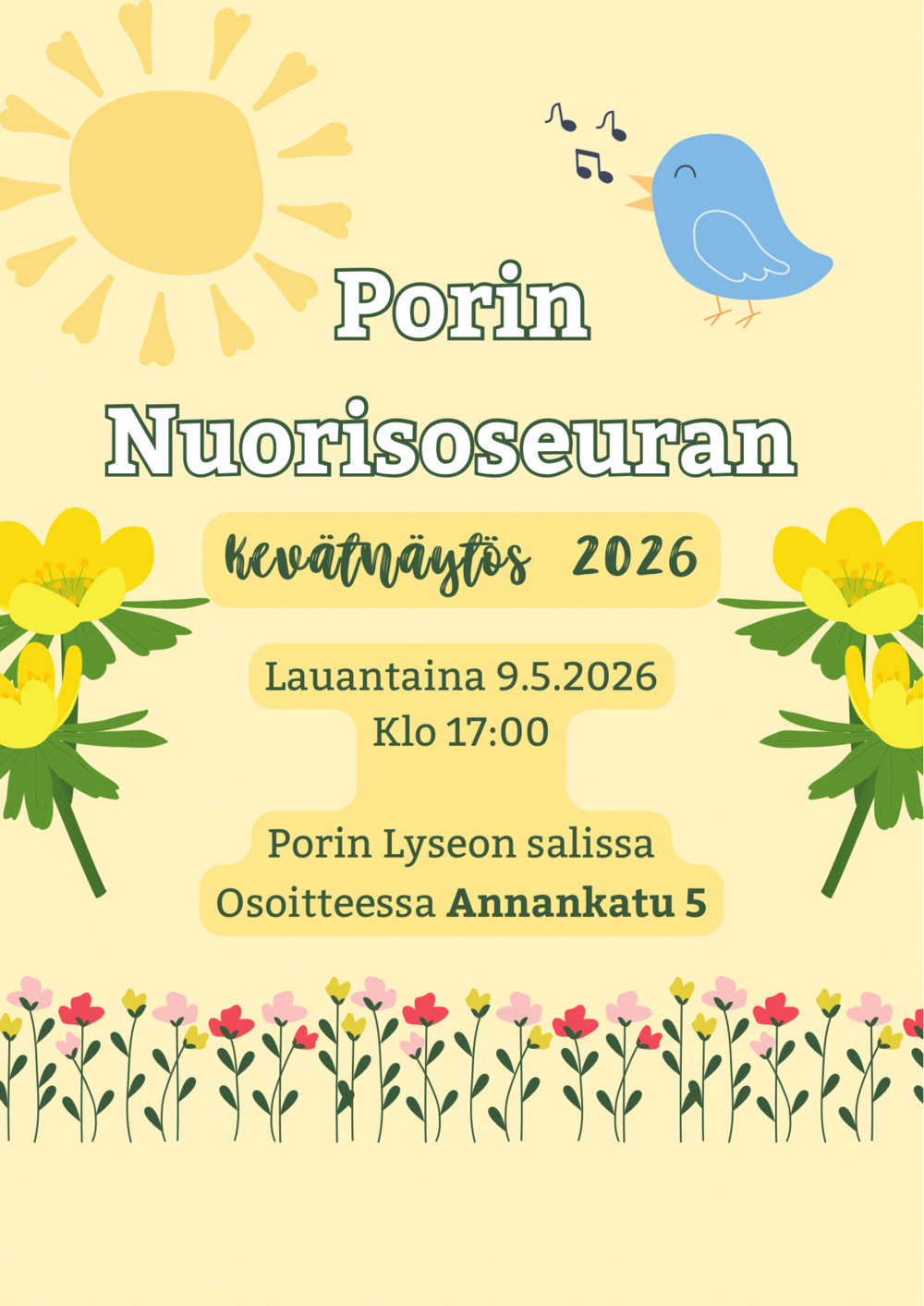 Porin Nuorisoseuran Kevätnäytös 2026 💃🏼 🗓️ 9.5.2026 klo 17:00 📍Porin Lyseon salissa osoitteessa Annankatu 5 Muista merkitä päivä kalenteriisi ja tule viihtymään esitysten parissa! Lisätietoa…